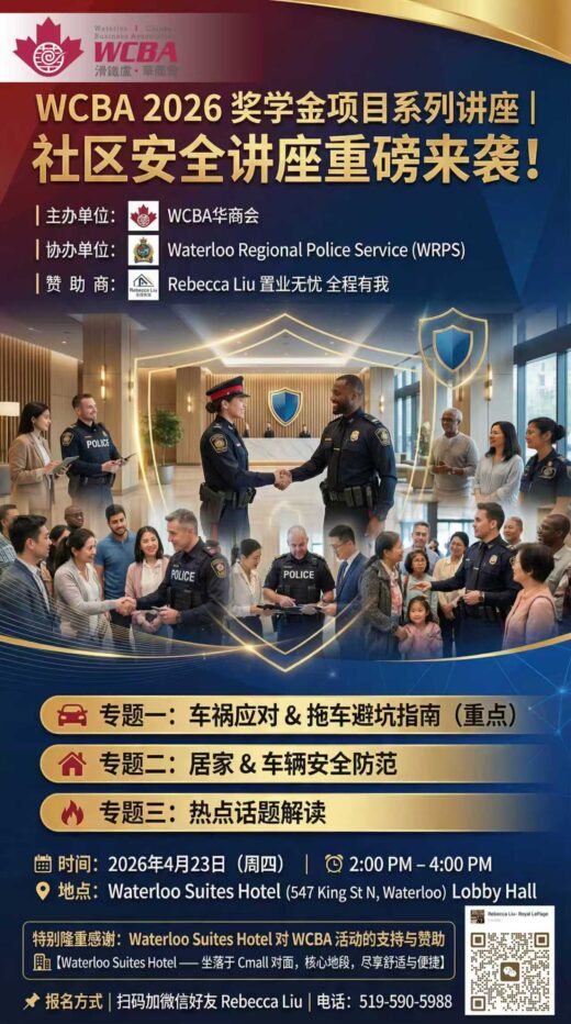 4月8日,滑铁卢华商会(WCBA)将举办一场特别的交流活动—「2026 奖学金项目特别茶话会|多伦多 × 滑铁卢商业新机遇」...