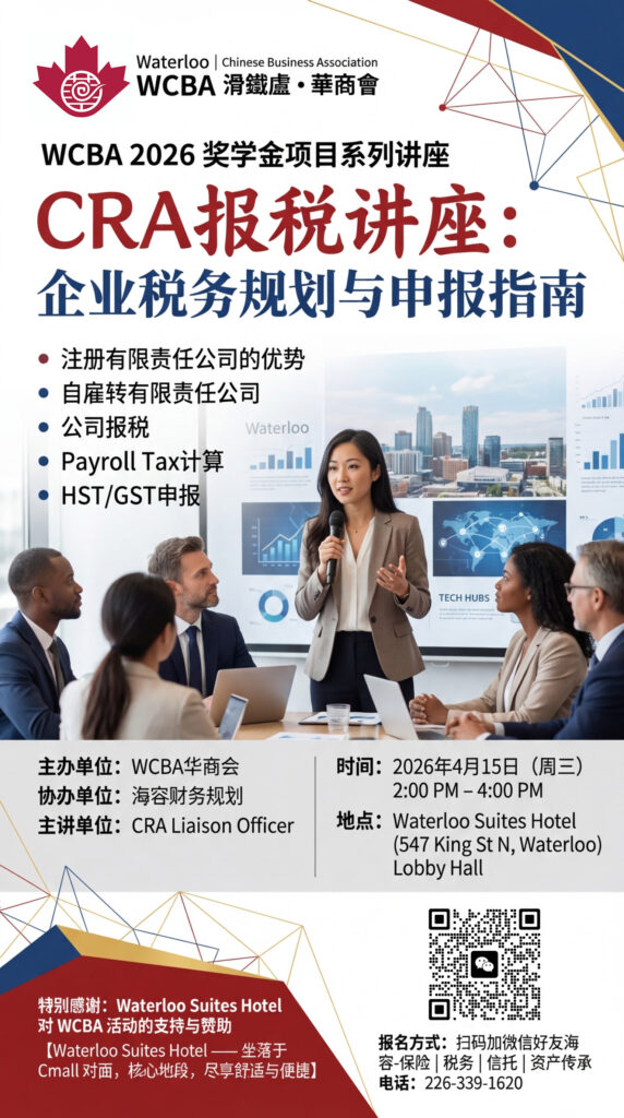 本次活动,滑铁卢华商会(WCBA)携手海容财务规划团队,特别邀请 CRA(加拿大税务局)Liaison Officer 现场开讲。